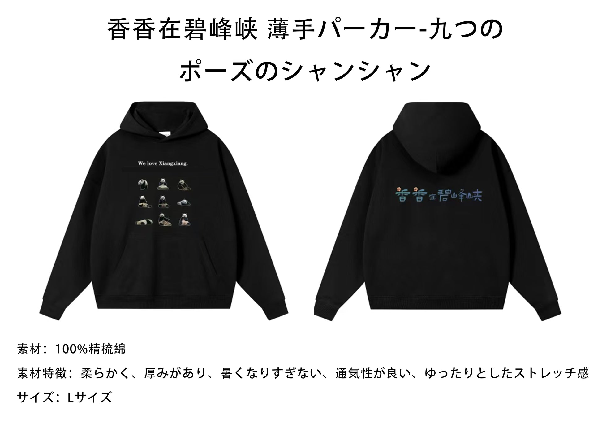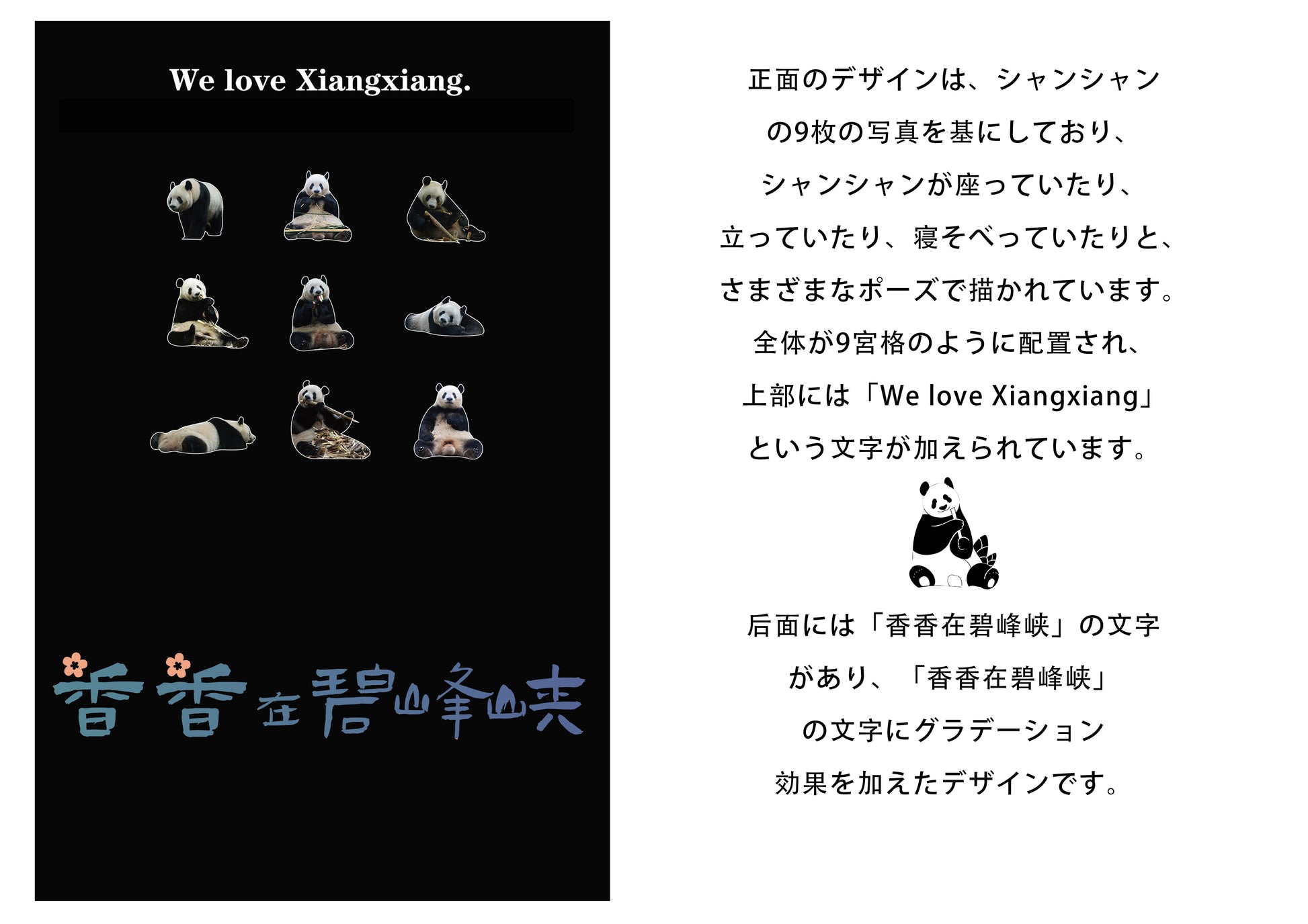 背面のデザインは、シャンシャンの9枚の写真を基にしており、シャンシャンが座っていたり、立っていたり、寝そべっていたりと、さまざまなポーズで描かれています。全体が9宮格のように配置され、上部には「We love Xiangxiang」という文字が加えられています。前面には「香香在碧峰峡」の文字があり、「香香在碧峰峡」の文字にグラデーション効果を加えたデザインです。